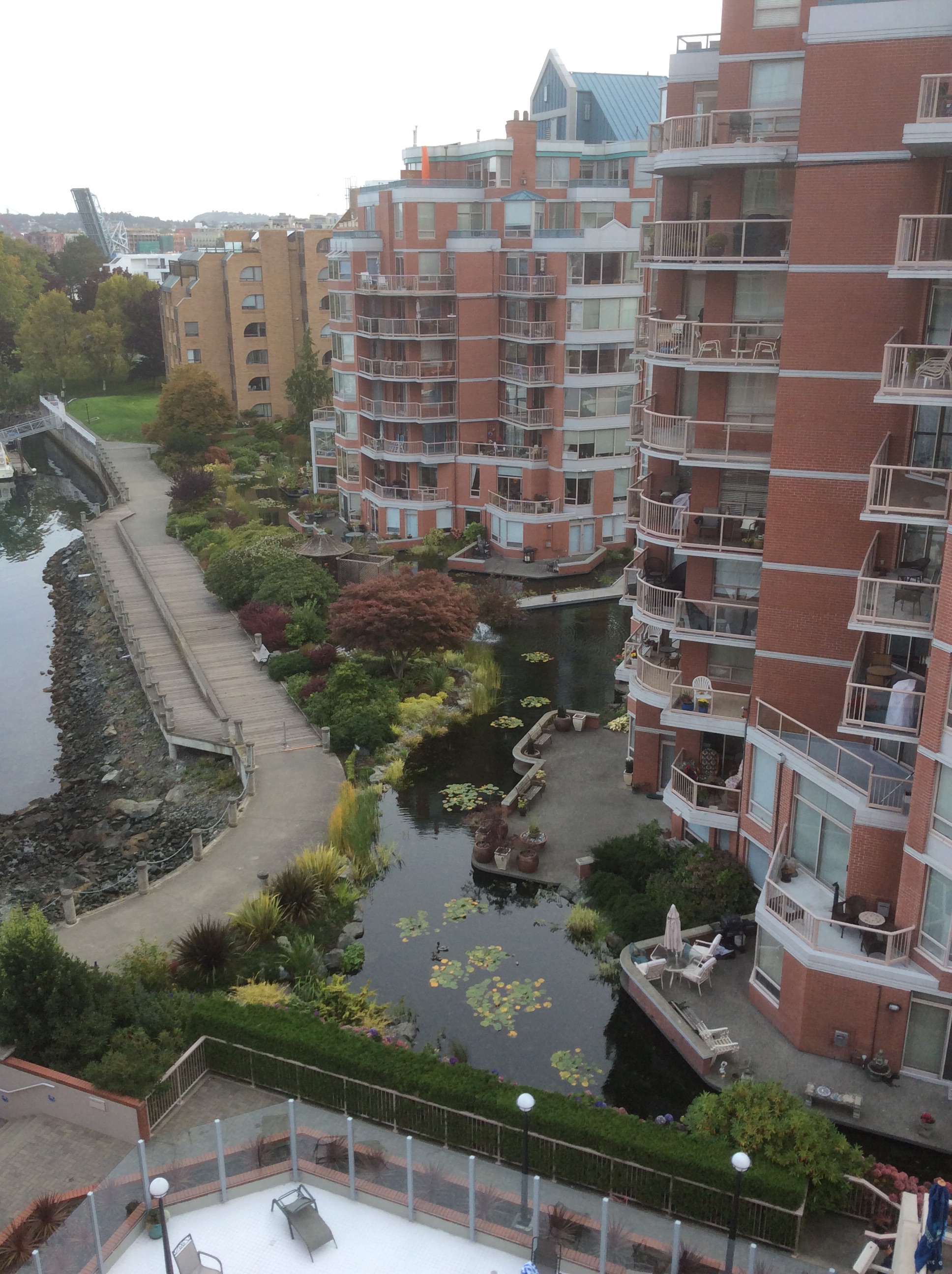 The residential building next to our hotel is partially surrounded by a water garden.