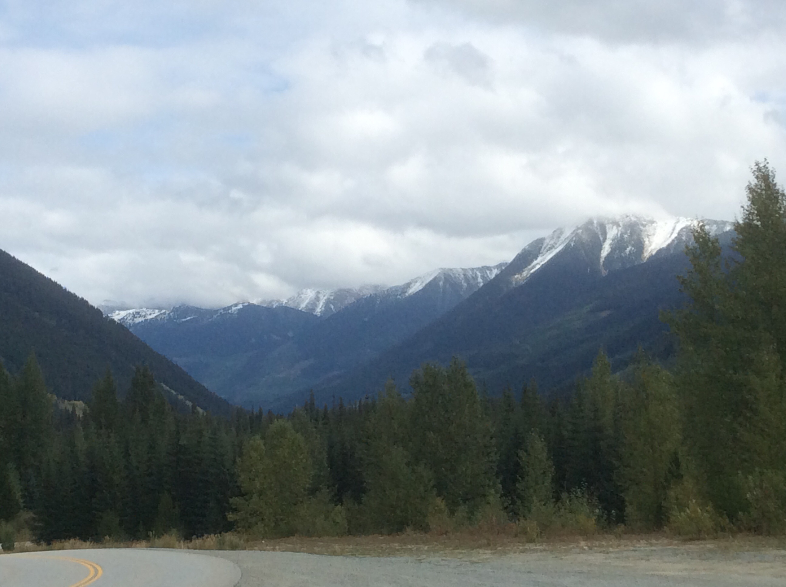 During this section of the drive it was spitting enough to require an occasional swipe of the wipers. As we climbed we saw fresh snow on the peaks.