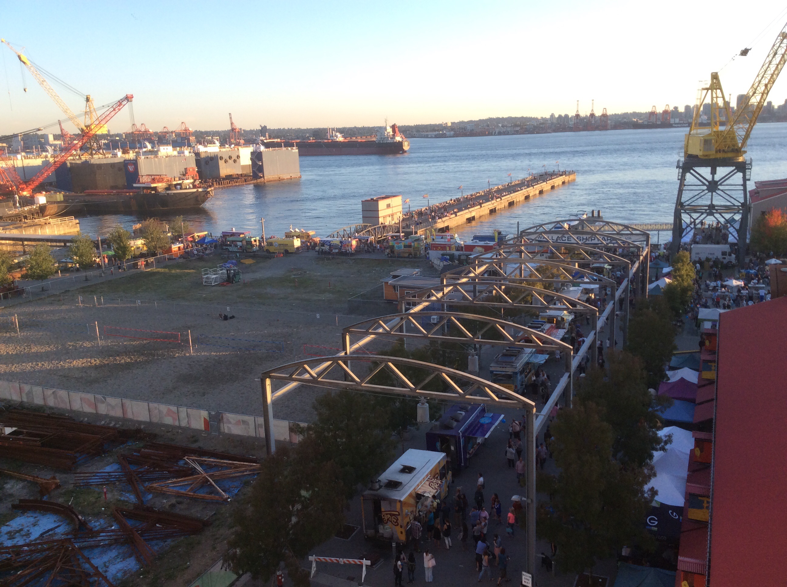Came back from Downtown stopping at the Lonsdale Market for a bottle of Okanagan Valley wine. We went out on our balcony to enjoy the wine and the view to discover a block party below. Apparently every Friday night the Food Trucks line up and are surrounded by a beer garden and stage with live music. How could we resist?